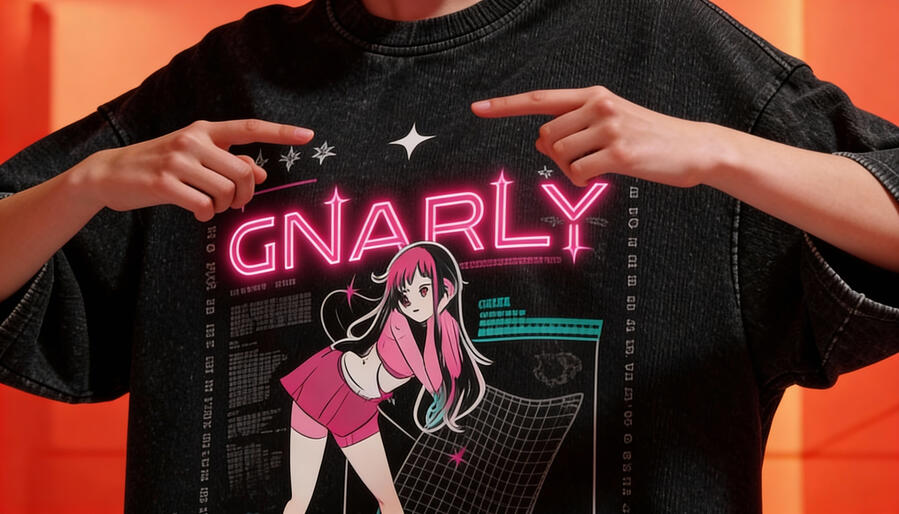 This visual presents the Gnarly t-shirt through an AI generated concept, where streetwear energy meets digital creativity. Created without physical styling or traditional photoshoots, artificial intelligence shapes the bold graphics, colors, and attitude into a striking visual statement. The oversized silhouette and graphic-driven design reflect a rebellious, playful, and unapologetic spirit capturing youth culture translated through technology. By removing real-world limitations, AI allows Gnarly to exist as more than apparel, transforming it into a digital expression of identity, confidence, and modern edge. A reminder that streetwear is not just worn, but communicated loudly, visually, and without compromise.